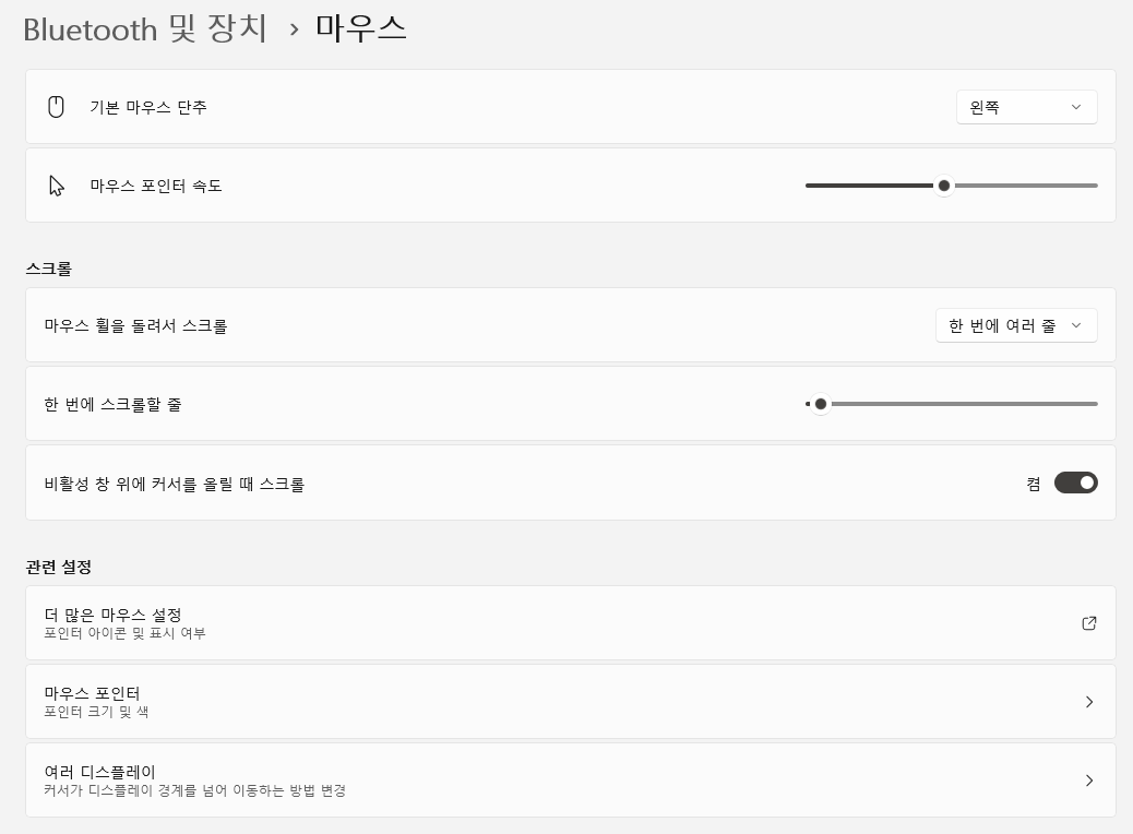 마우스 카테고리에 들어가보면 하단에 관련 설정이 두가지가 보이는데 마우스 포인터와 마우스 입니다.
